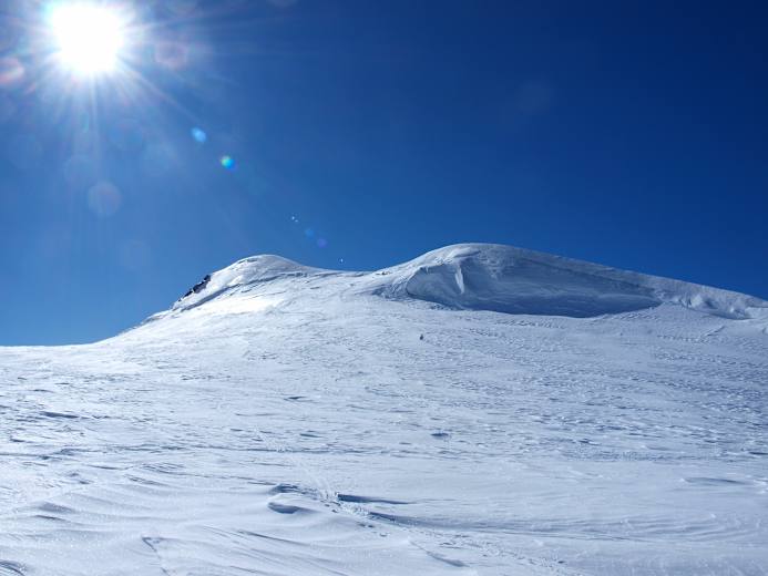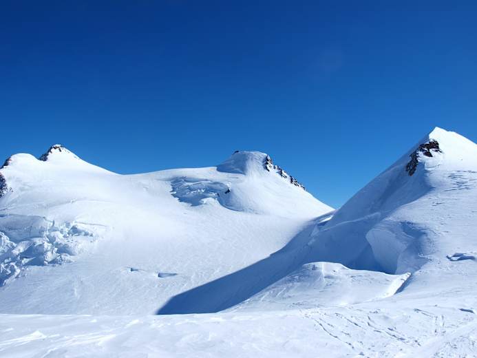 Von hier aus steigt man etwas steiler zum Lysgletscher hoch und folgt der steilen Rampe nach links, bis man das Schneetal unterhalb des Balmenhorns erreicht. Hier verlässt man den Hauptweg gegen Osten und steigt zunächst flach, dann nach einer weiteren Wende gegen Süd etwas steiler auf die Vincentpyramide (4.215 m). Die Ausblicke nach Süden sind fantastisch und bei windfreiem Wetter machen wir hier auch unsere erste, längere Pause.