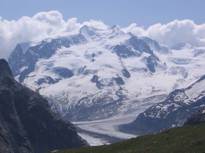 Man hält sich beim Abstieg durch den Grenzgletscher ostseitig und wechselt, sobald dies möglich ist und Wegmarkierungen sichtbar werden, über die Moräne auf felsigen Untergrund. Dieser Weg führt weiter nach unten zur neu erbauten, sehr modernen Monte Rosa Hütte. Hier legt man eine wohlverdiente Pause ein, genießt das Panorama über den Gornergletscher.
