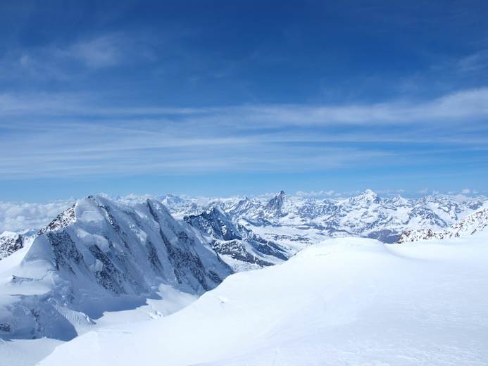 Der letzte Tag der fünf-tägigen Spaghetti-Tour verläuft aufregend entlang des Grenzgletschers zur Monte Rosa Hütte (2.883 m) und weiter über den Gornergletscher nach Rotenboden und schließlich per Bahn nach Zermatt. Die grandiose Lyskamm Nordwand ist der Hingucker schlechthin. Die umliegenden Viertausender der Walliser Alpen natürlich nicht zu vergessen.