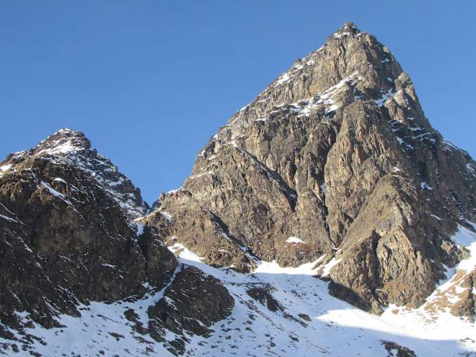 Im Gipfelbereich ist eine kurze Stelle im II. Grad zu überwinden und für die gesamte Tour, inkl. Abfahrt sollte man rund 5 h einplanen.