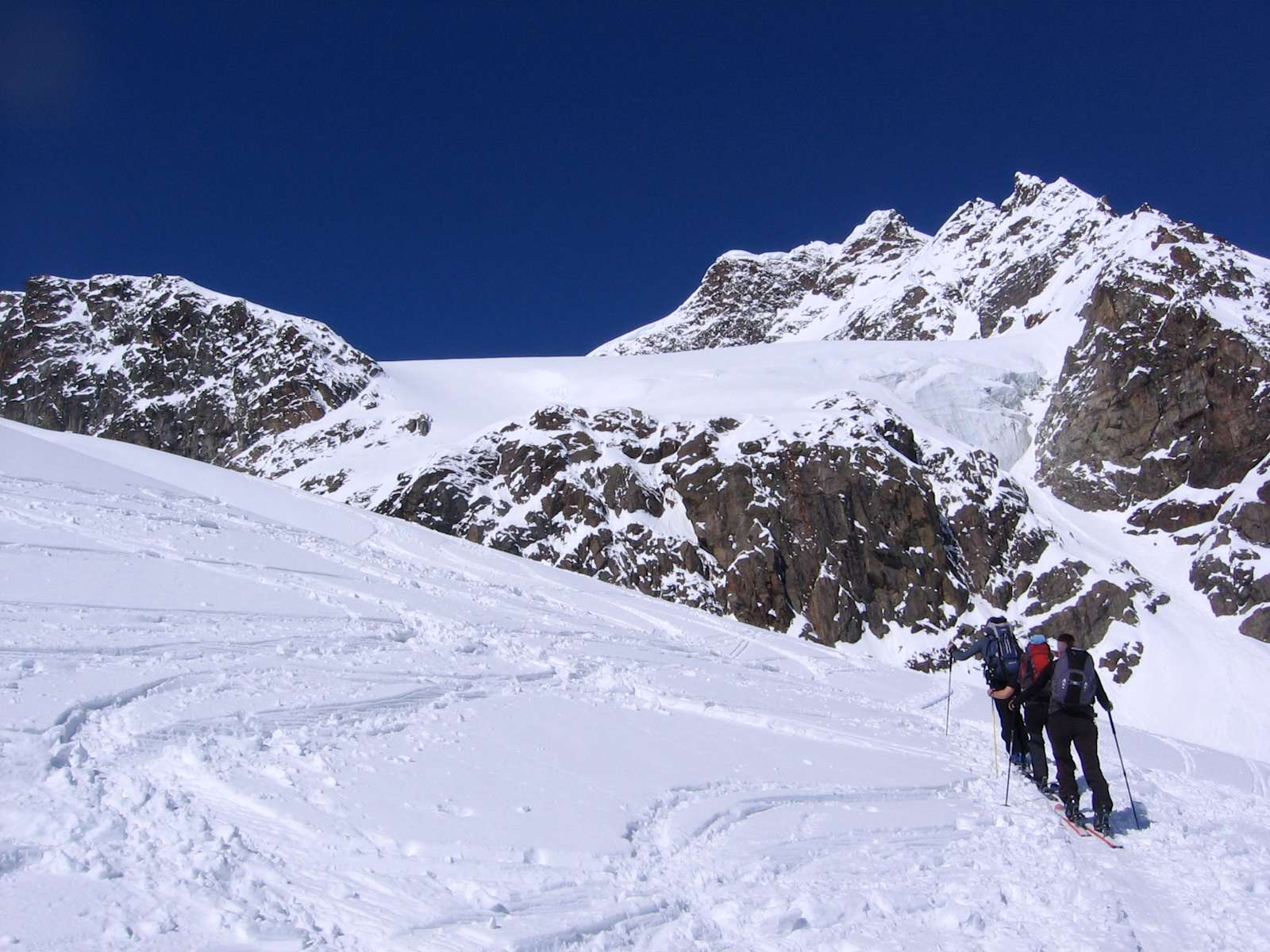 Das Skidepot errichtet man an der Buin-Lücke, dem steilen Übergang nach Süden ins Engadin. Zu Fuß (je nach Verhältnissen mit Steigeisen, Pickel, Helm, eventuell Seil zur Sicherung für ein kurzes Stück (2 m) quert man leicht ansteigend die Westflanke nach Norden.