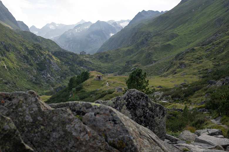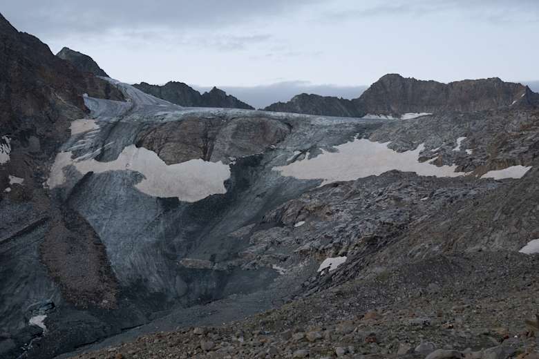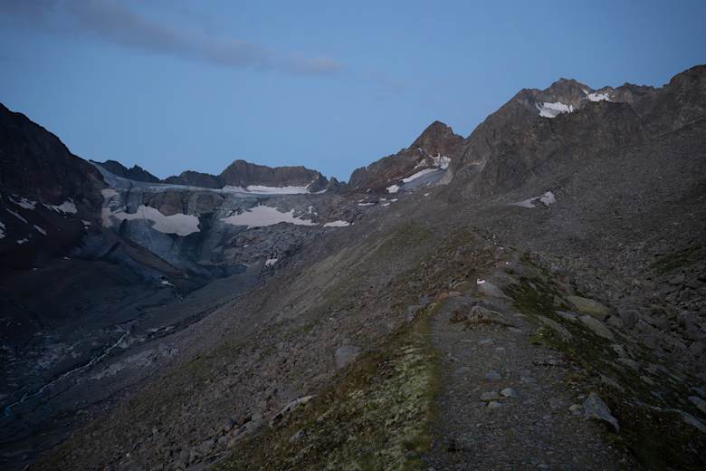 Entlang der Aufstiegsroute. Im Bereich der Moräne kann eine kleine Variante gewählt werden. Man folgt dazu beim Wegweiser (ca. 2.625 m) dem Moränenrücken weiter abwärts (alte Markierungen) und gelangt über einen steilen und etwas direkteren Weg in den Talboden. Bequemer ist die Aufstiegsroute.