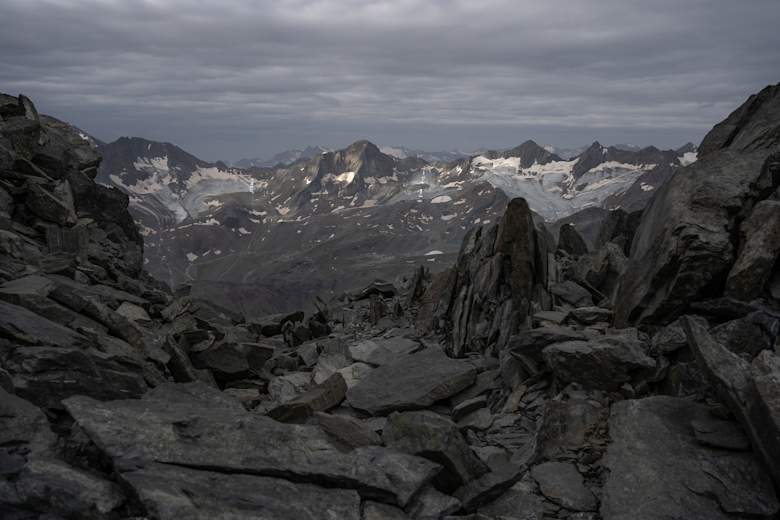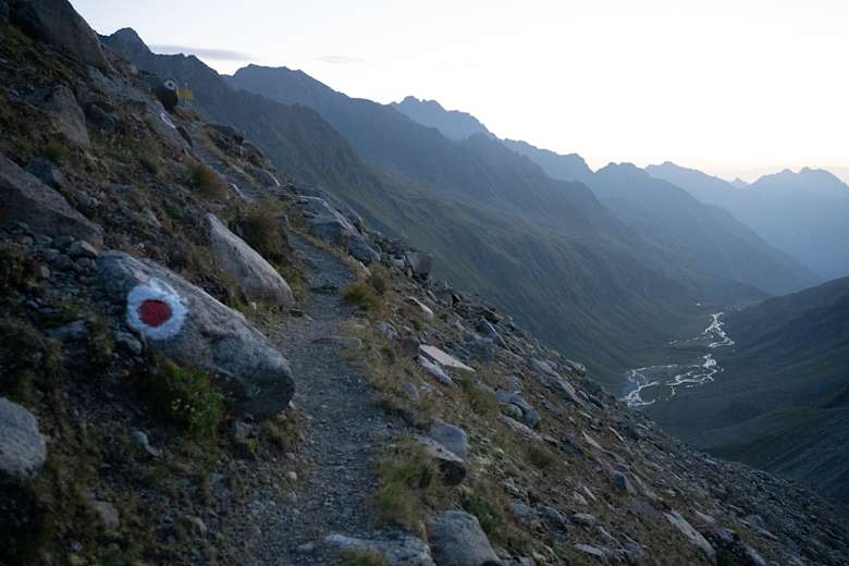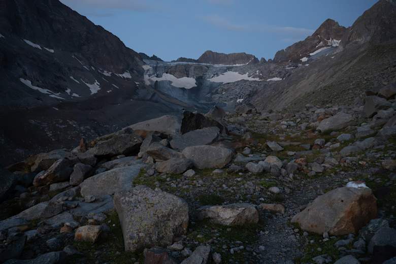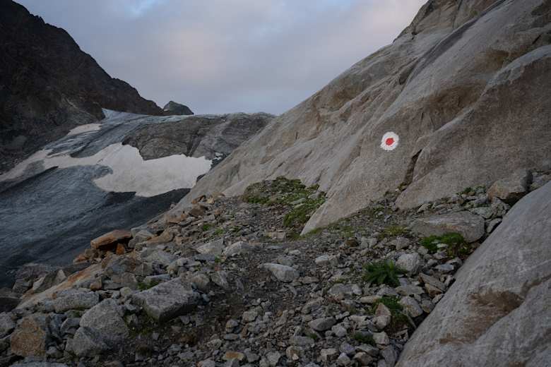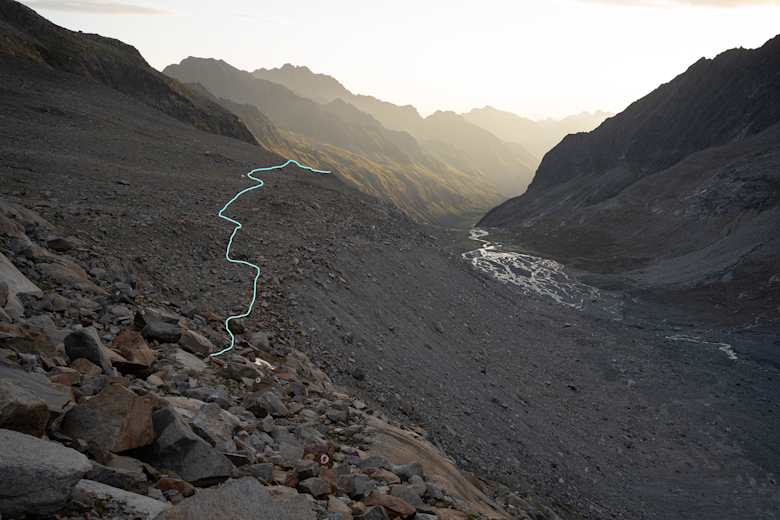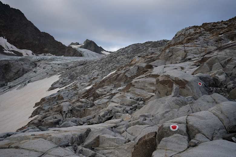 Die Markierungen führen in leichtem Auf und Ab durch Moränenschutt und Blockgelände. Foto: Matthias Knaus