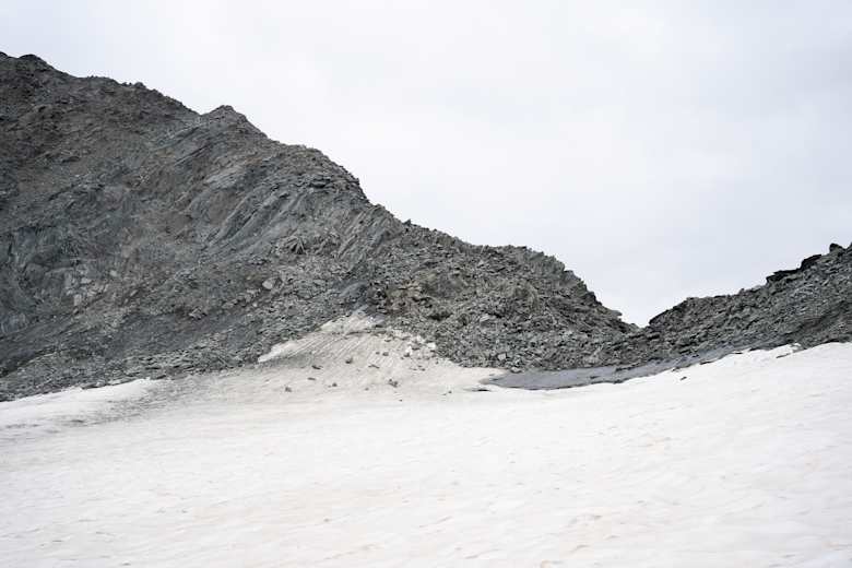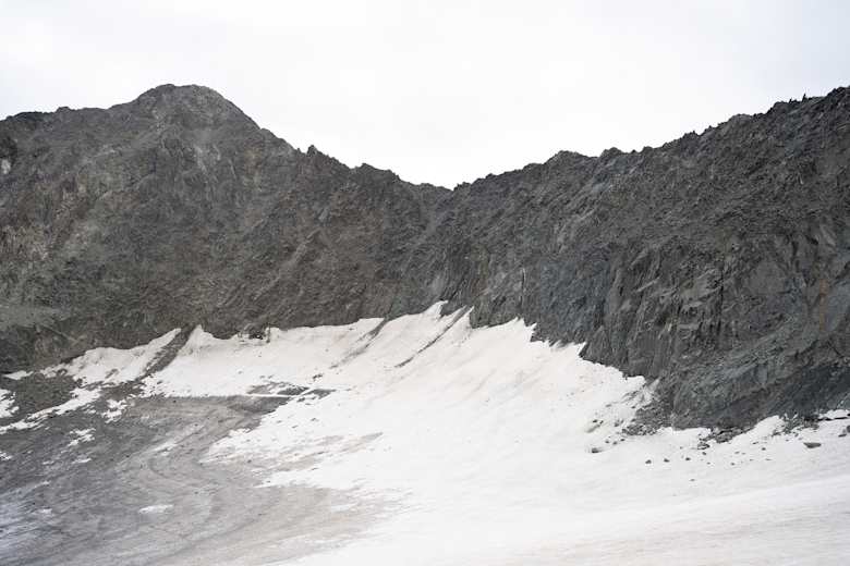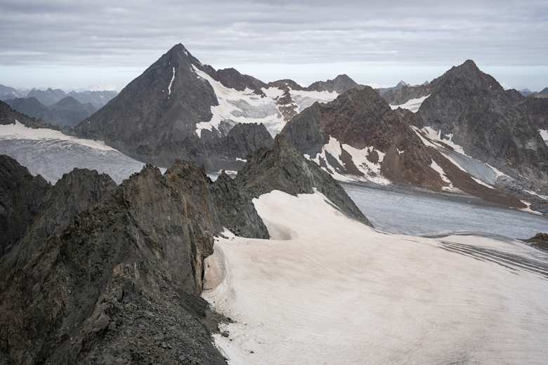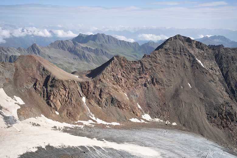 Der oberste Rand des Gletscherbeckens im Bereich der Oberen Hölltalscharte. Der Gipfel der Ruderhofspitze ist erkennbar, über den Kamm rechts des Gipfels führt der Anstieg. Foto: Matthias Knaus