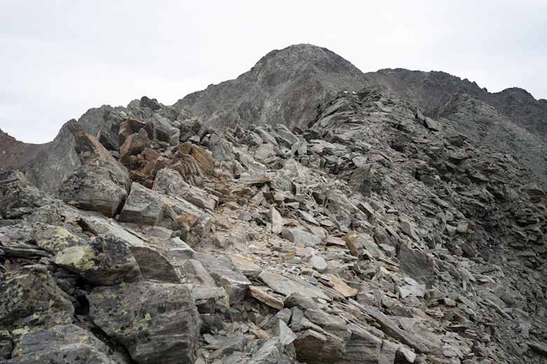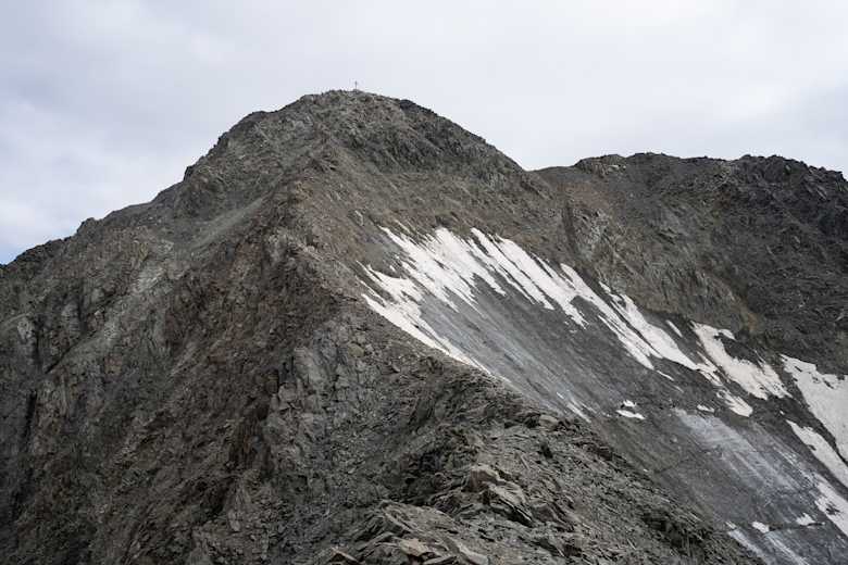 Ab der Oberen Hölltalscharte folgt man dem Gipfelkamm nach Nordosten. Man bewegt sich im Blockgelände, nicht immer sind alle Blöcke fest. Besonders behutsam sollte man sich auf den Blöcken im Bereich der Oberen Hölltalscharte bewegen – dort liegt abschmelzendes Eis unterhalb. Bis zum letzten Aufschwung unter dem Gipfel ist das Gelände nicht sonderlich steil. Es empfiehlt sich nicht in die Flanken seitlich des Kamms auszuweichen, diese sind brüchig. Mit Blick auf den kleinen Rest des Ruderhofferners (rechts) gelangt man im zunehmend steiler werdenden Gelände zum Gipfel. Einzelne Stellen erfordern den Einsatz der Hände und hie und dort ist loses Blockwerk zu berücksichtigen.
