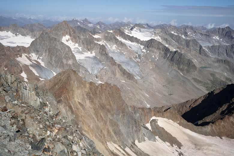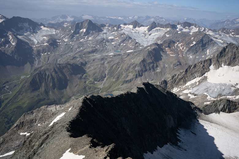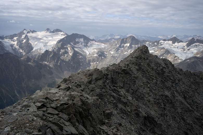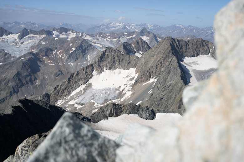 Blick über den Gipfelkamm zum Stubaier Hauptkamm mit Wildem Pfaff, Zuckerhütl und Sulzenauferner. In Bildmitte und rechts davon, der Stubaier Gletscher. Am Horizont, die vergletscherten Gipfel um das Gurgler Tal. Foto: Matthias Knaus