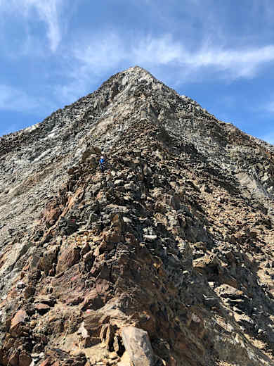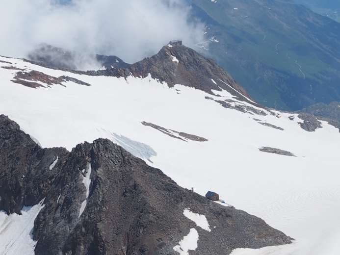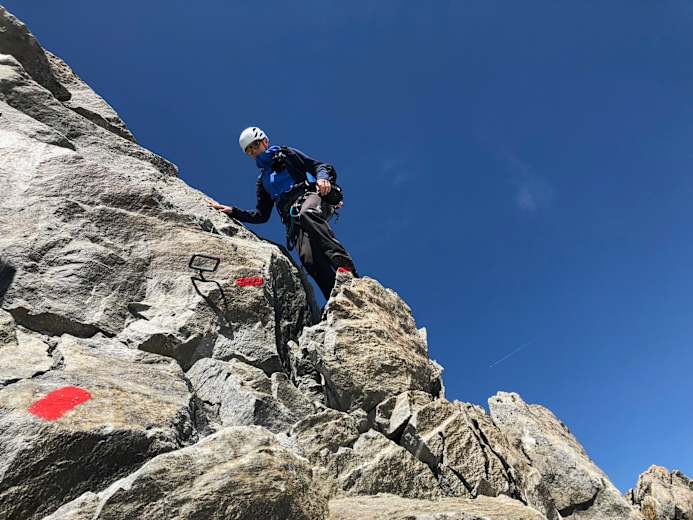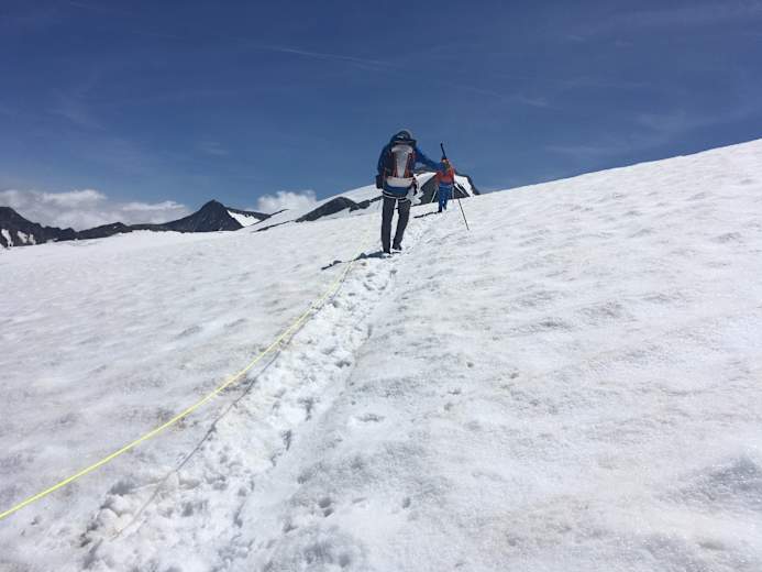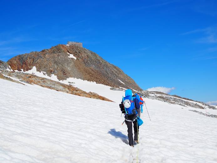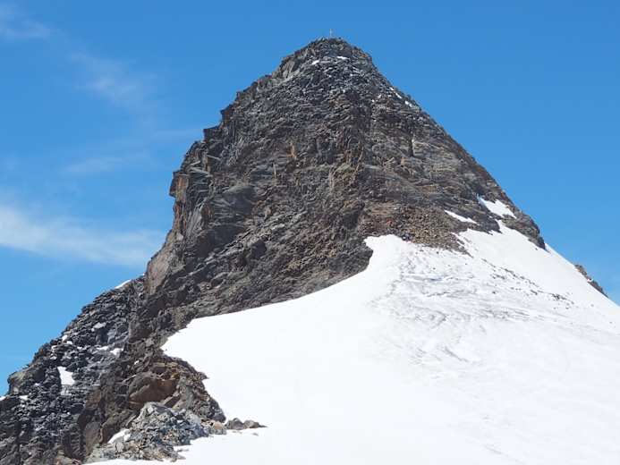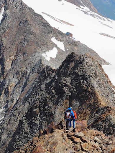 Man steigt in den Pfaffensattel ab und hat dann die steile - bis zur 45 Grad! - Firnflanke vor sich. Meist kann man schon in den Morgenstunden stapfen, aber wissen kann man es nie - daher unbedingt die Steigeisen mitnehmen! Der letzte Teil verläuft über den Felsen bis zum Gipfel auf 3.507 m.