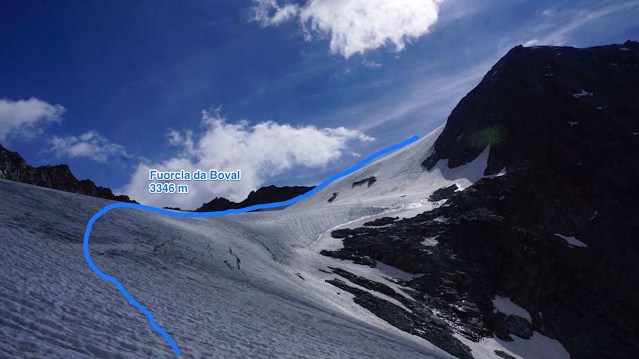 Über den hier noch flachen Gletscher in einem Rechtsbogen zur Fuorcla da Boval, 3.346 m. Hier geht’s es dann weiter Richtung Süden, zuerst steiler dann über den Nordost Hang hinauf zum Gipfel.