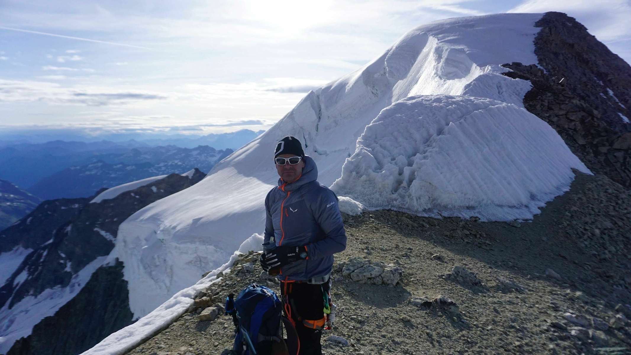 5:40 Uhr: Links hinten sieht man noch die Marco e Rosa Hütte Foto: Stephan Mitter Der Piz Bianco von der Bellavista Foto: Stephan Mitter Auch hier mit gebührendem Abstand Foto: Stephan Mitter Am Ende des Spinat Grates mit dem Esten Palü-Gipfel Foto: Stephan Mitter Am Piz-Palü-Mittelgipfel auf 3.900 m Foto: Stephan Mitter Schmaler Abstieg vom Mittel- zum Ostgipfel Foto: Stephan Mitter Schmaler, ausgesetzter Grat Foto: Stephan Mitter Schmaler Grat Foto: Stephan Mitter Im Gletscherbruch Foto: Stephan Mitter Blick vom Palü bis zum Morteratsch Foto: Stephan Mitter Bildergalerie (10)