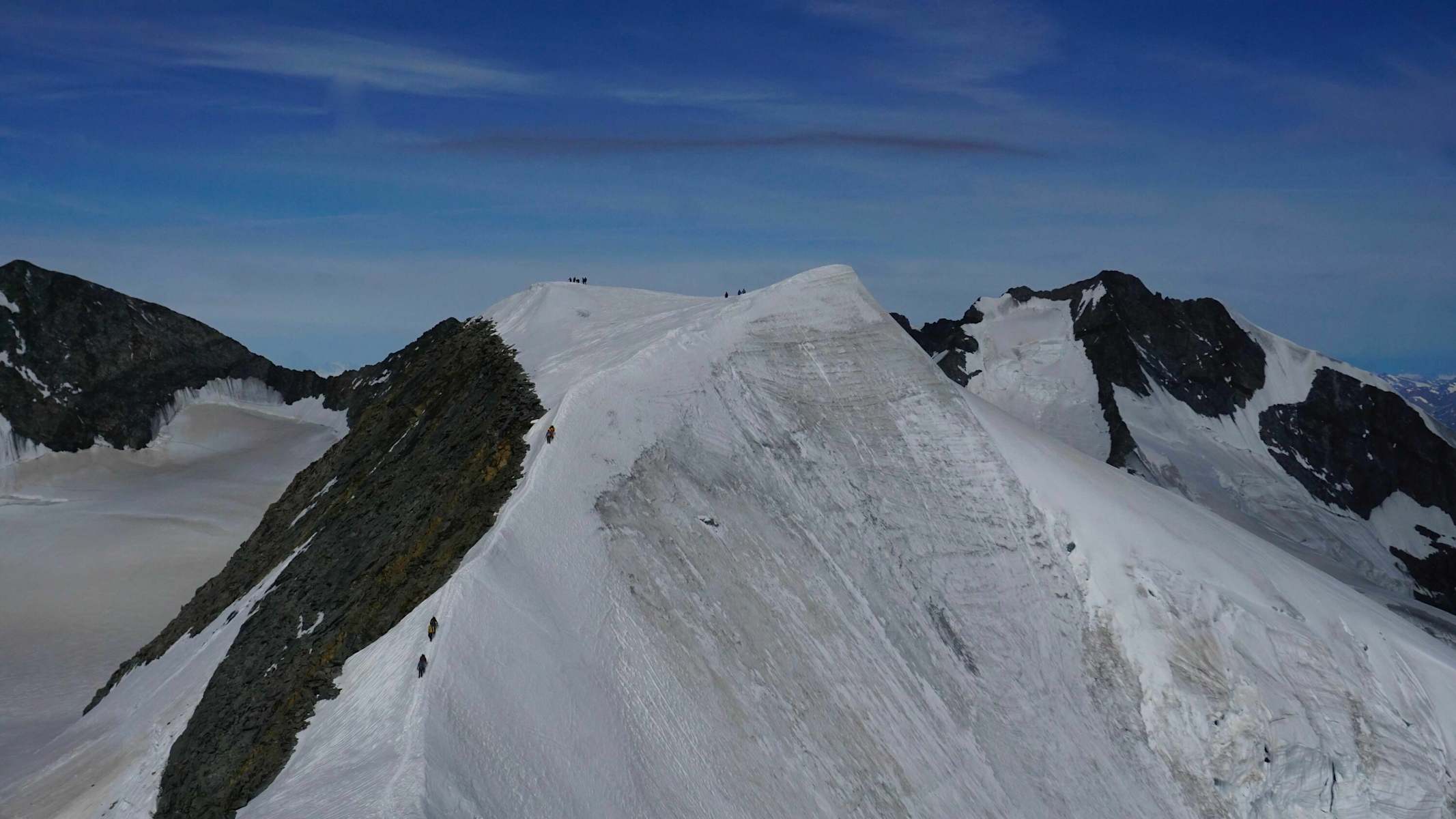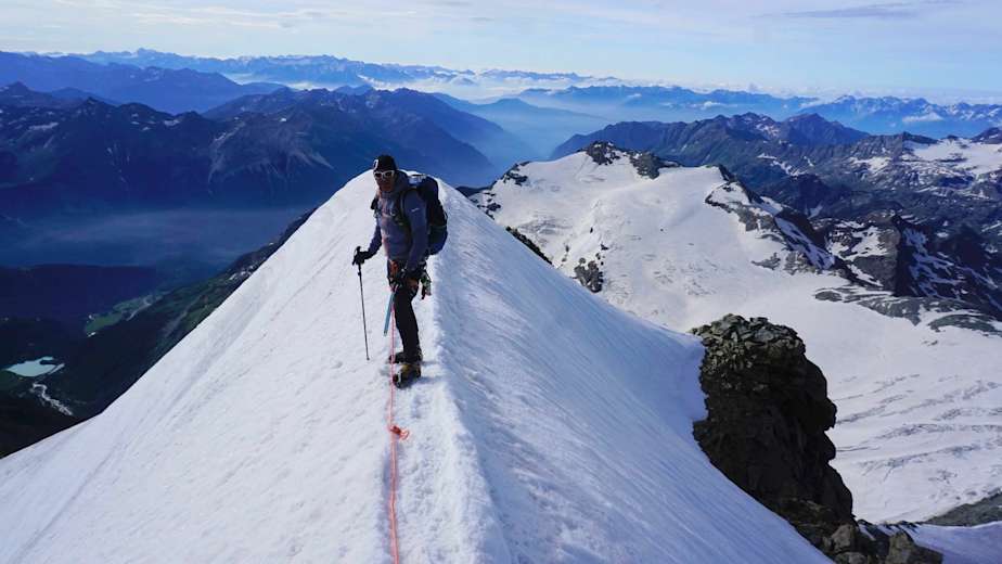 Nach dem Felsgrat geht es mit Steigeisen auf den Palü Westgipfel, 3.898 m, und weiter auf den Palü Mittelgipfel, 3.900 m. Der Abstieg verläuft dann über einen schmalen Schneegrat und wieder hinauf zum Ostgipfel, 3.882 m.