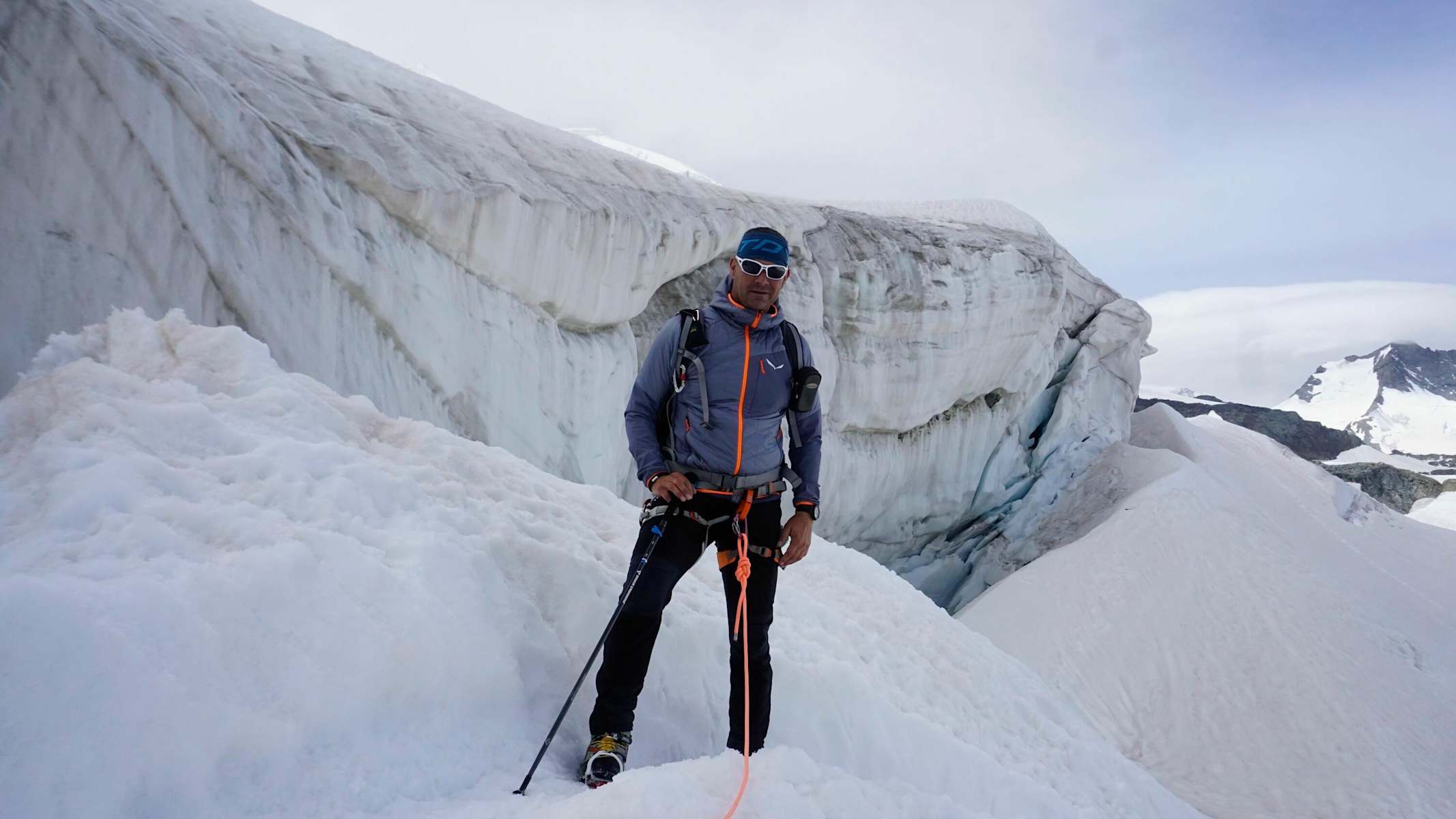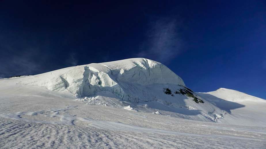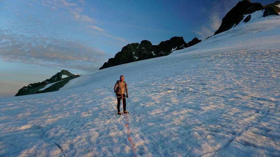 Von der Marco e Rosa Hütte geht es frühmorgens über die Bellavista zur Fuorcla Bellavista, 3.673 m. Dabei passiert man schmale Spaltenbrücken und geht unter eindrucksvollen Seracs vorbei.