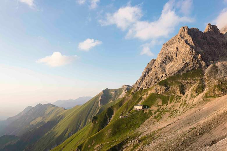 Trettachspitze, Mädelegabel und Hochfrottspitze ragen als mächtige Gipfel direkt hinter dem Waltenberger Haus in den Allgäuer Alpen auf. Und sie wollen natürlich auch bestiegen werden. Während der Gipfel der Mädelegabel über den Heilbronner Weg relativ einfach zu erreichen ist, ist die Besteigung der Trettachspitze schon ein sehr ernstes, klettertechnisch nicht ganz einfaches Unterfangen. Im Aufstieg über den Nordostgrat gilt es, Kletterstellen bis zum III. Schwierigkeitsgrad, im Abstieg bis II+ zu überwinden.