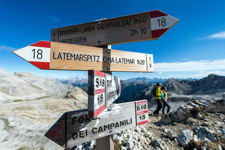 Man kann für den Abstieg auch eine weniger steile, aber länger Route wählen. Dafür geht man von der Latemarscharte auf Weg Nr. 517 hinunter zum Karerpass und auf der Straße bis zum Grand Hotel zurück.