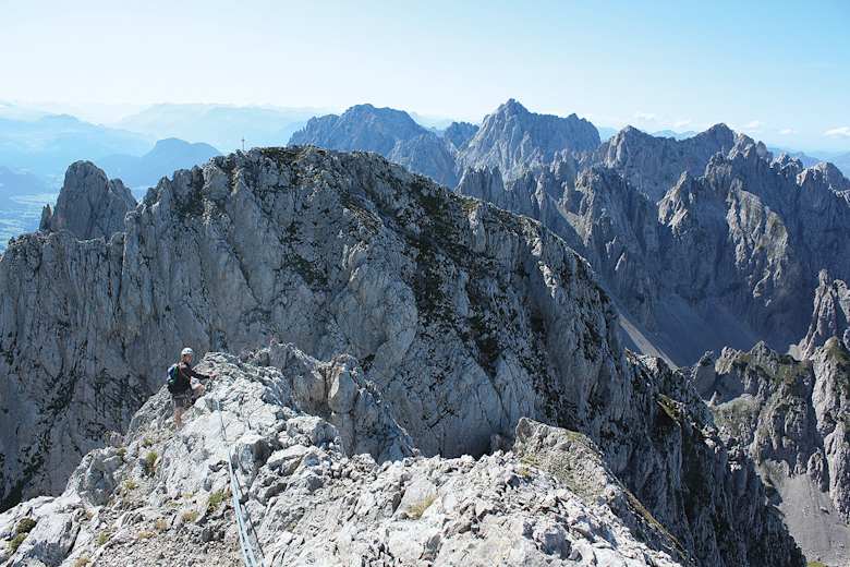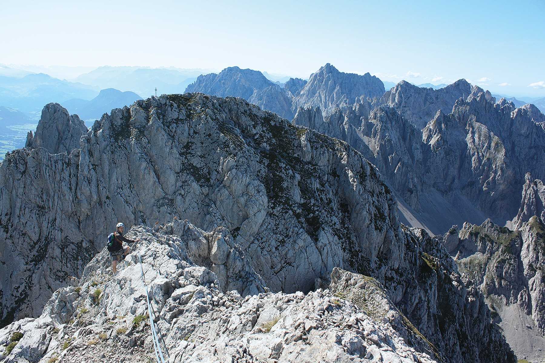 Anspruchsvolle, alpine Grattour im Ostkaiser in Tirol. Die landschaftlich herausragende, alpine Herausforderung mit ihren ausgesetzten Überschreitungen von drei Gipfeln und dem schwierigen Abstieg durch Rinnen und über steile Grashänge ist nur bei wirklich stabiler Wetterlage zu empfehlen.
