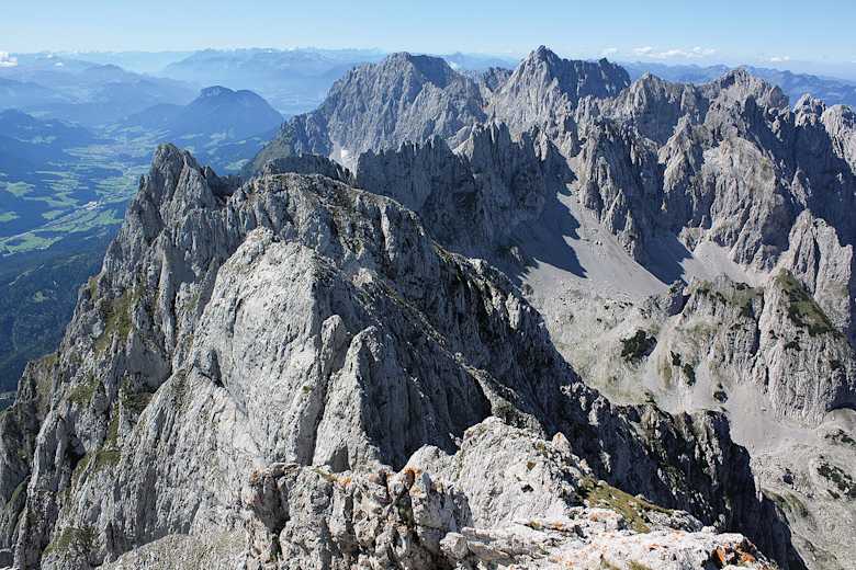 Blick von der Ackerlspitze nach Westen. Die beiden vorderen Gipfel sind die Hochgrubachspitzen. Foto: Thomas Otto