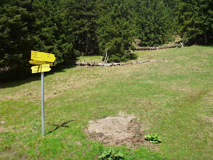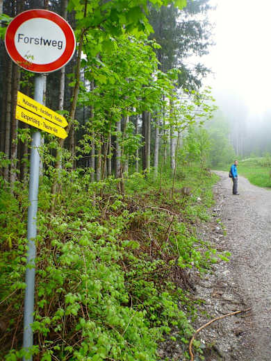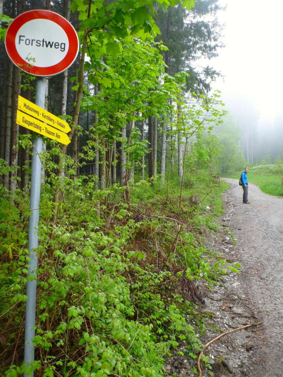 Vom Parkplatz startet man in nordwestlicher Richtung den breiten Weg zur Thaureralm - Vintlalm. Nach ca. 200 m überquert man den Fahrweg zum Rechenhof und kommt auf einen kleinen schmalen Steig, der Richtung Kiechelberg führt. Kurz vor dem Kiechelberg, wo der Steig wieder in einen breiten Forstweg mündet, auf einer Höhe von ca. 1000 m, muss man sich rechts halten.