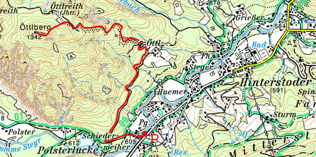 Auf der Forststraße Richtung Polsterlucke / Prielschutzhaus, nach 500 m Abzweigung nach rechts Richtung Öttl, 150 m vor dem Öttl-Bauernhof eine Forststraße links hinauf bis in den Wald. In der letzten Linkskehre beginnt der unmarkierte Reitsteig.