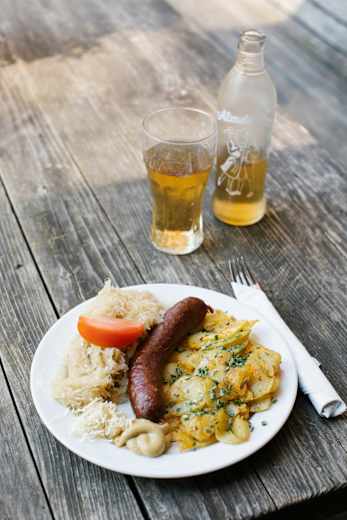 Wurst mit Bratkartoffeln und Sauerkraut auf der Neuen Magdeburger Hütte Foto: Elias Holzknecht Bildergalerie (4)