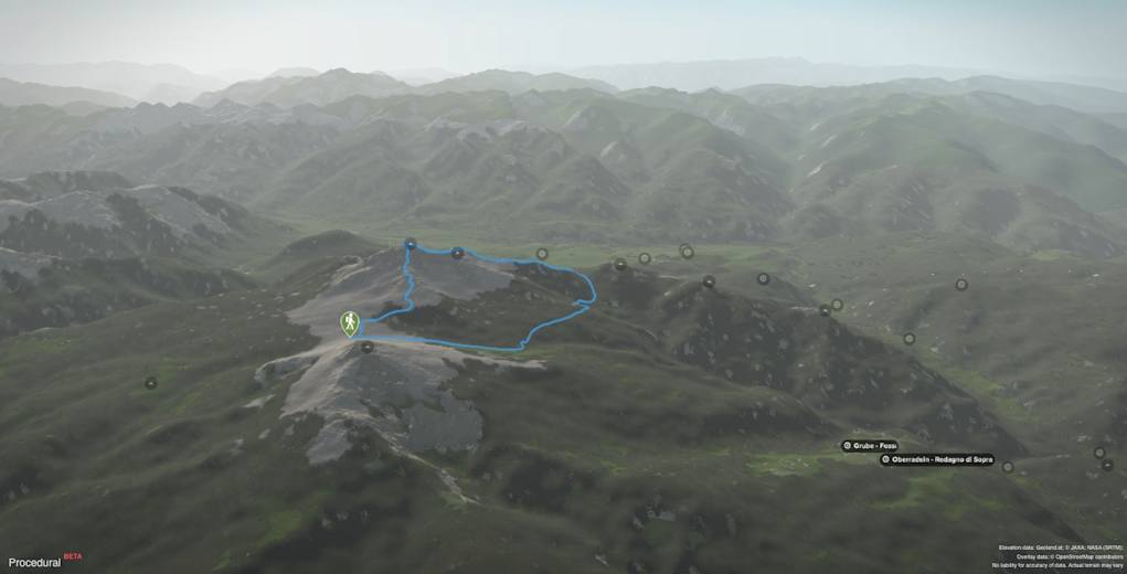 Weiter auf dem Weg 502 über die Cime di Ronches hinab zum Kugeljoch. Über die Untere Kugelalm und auf dem Weg 14 zur Isihütte. Abschließend wandert man über Almwiesen auf dem Weg 7 zurück zum Ausgangspunkt, dem Gasthof Jochgrimm.