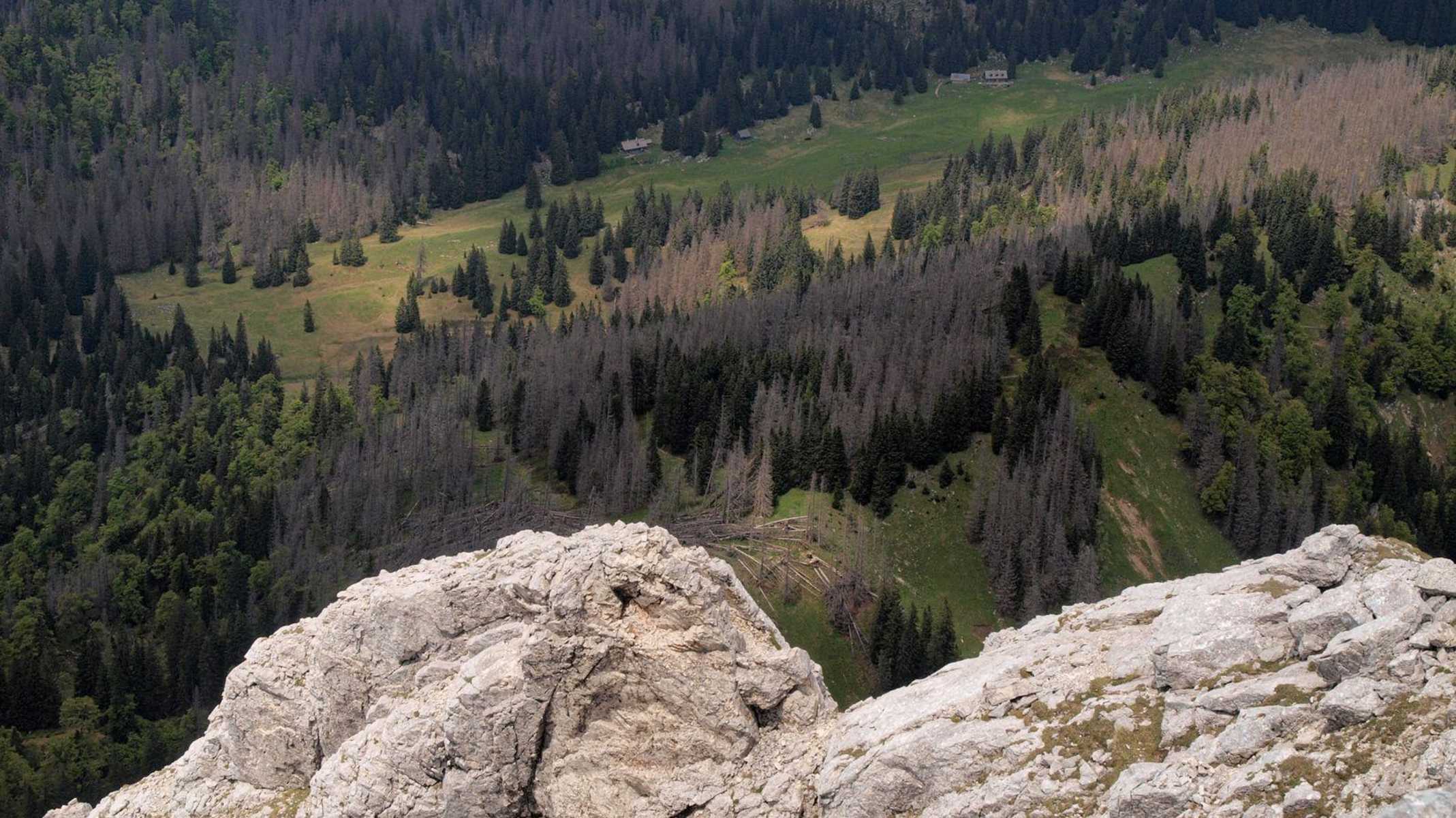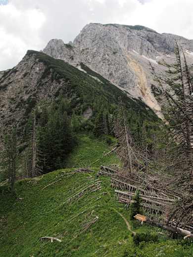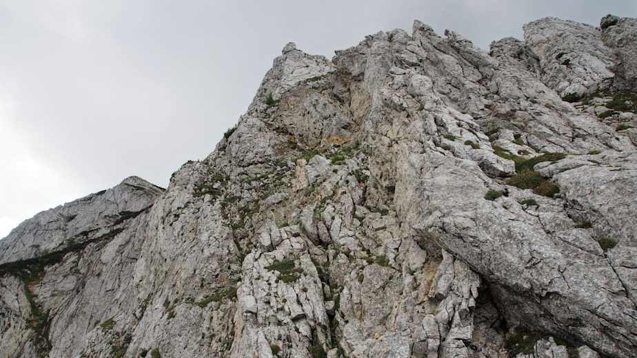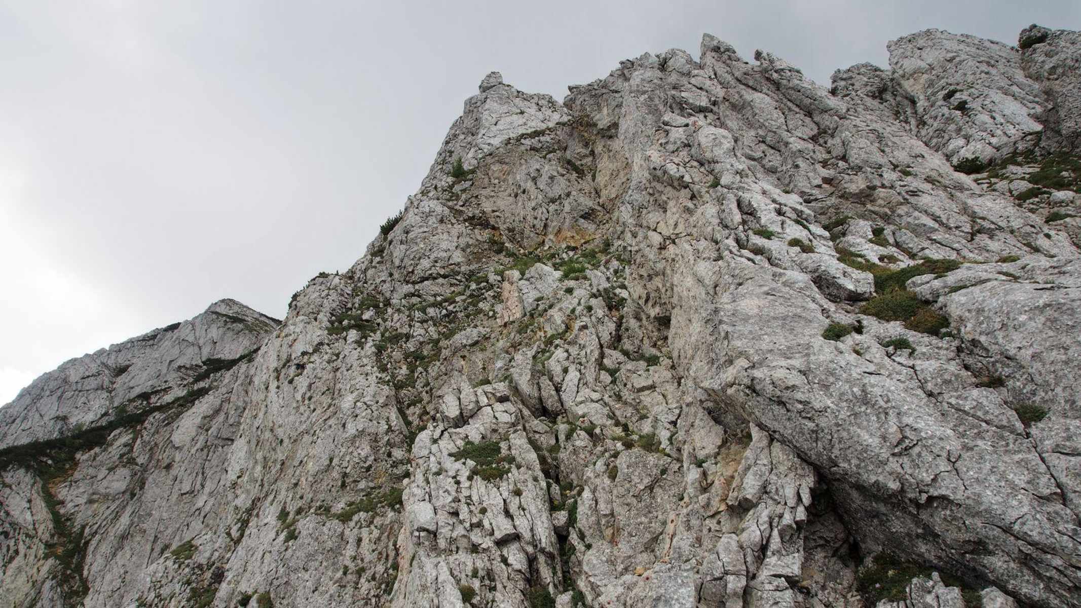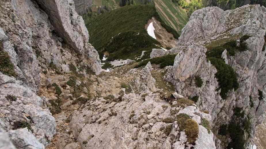 Die Verschneidung empor und ausgesetzt einen kleinen Kamin nach rechts aussteigen. Unschwierig links haltend zum „Dreimeterwandl“, das entweder direkt (II) oder etwas leichter in gutgriffigem Fels in Richtung eines kleinen Felsturmes schräg nach rechts oben ausgequert werden kann. Unschwierig entlang des Grats weiter durch kupiertes Gelände über Rasenstufen, Schrofen, Platten und durch Latschen auf die Hochfläche bis zum Ausstiegssteinmann, unterhalb dem man auf den markierten Weg trifft.