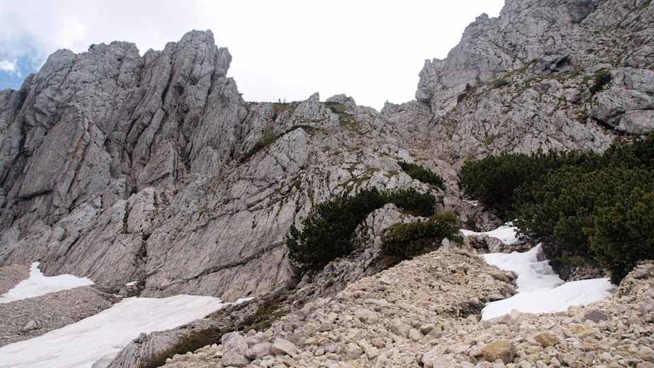 Zuerst direkt hoch und später in leichtem Rechtsbogen über losen Schutt bis in eine steile Schrofenrinne, die entweder direkt oder leichter links davon über Rasenstufen bis in einen kleinen Sattel (Steinmanndl) erstiegen wird. Nun nordwestl. dem Grataufbau bis in eine Verschneidung links unterhalb einer vorspringenden Wand folgen (Steigspuren). Schwierige Abschnitte sind ab hier mit Verbundhaken versehen.