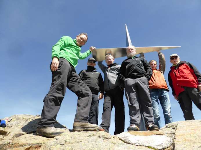 An der Brücke zur Pforzheimer Hütte (2.308 m) folgen wir der Beschilderung und der Rot/Weiss/Roten Markierung. Neben der Farbmarkierung stehen einige gut sichtbare Steinmänner, die die Wege kennzeichnen. Über den Wiesenhang an der Pforzheimer Hütte geht es weiter bergauf und ein erstes Plateau ist erreicht. Weiter mit mäßigem Anstieg gelangen wir auf eine Schulter (2.750m) vor dem eigentlichen Gipfelanstieg. Der letzte Anstieg führt über Serpentinen im Geröll und Gras, später über ein Blockfeld stets aufwärts. Ab hier ist eine erhöhte Trittsicherheit erforderlich. Nach einer kleinen Kante mit einem großen Steinmann ist das Gipfelkreuz fast zum Greifen nahe. Noch eine kurze Anspannung und wir stehen auf dem Gipfel. Der Abstieg erfolgt über den gleichen Weg.