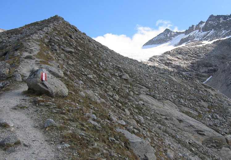 Nach dem Parkplatz bzw. nach dem Alten Pocher der Schotterstraße folgen. Weiter geht es, bevor es hinunter zu einem Staubauwerk geht, nach links auf einen markierten Pfad vorbei an Messstationen (auf AV Karte mit O.M. Ombrometer gekennzeichnet) bis zum letzten Ausläufer des Kleinfleisskeeses.