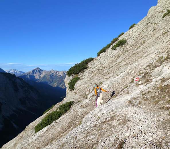 Anfangs folgt man von der Pfeishütte aus dem breiten Fahrweg nach Scharnitz bevor man nach einem kleinen Gegenanstieg ins Kaskar und Praxmarerkar abbiegt. Ab dort immer den Wegmarkierungen und Beschilderungen ins Kaskar und weiter ins benachbarte Praxmarerkar folgen. Im Kar angekommen, quert man bergwärts eine breite Wiesenfläche, die einen zum Beginn der ersten Kletterstelle I führt. Weiter über eine Schotterreise zur Schlüsselstelle dieser Tour.