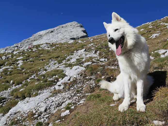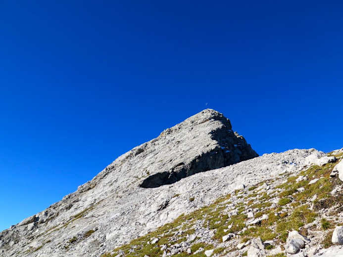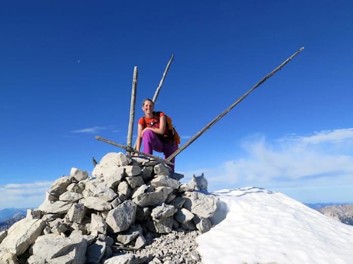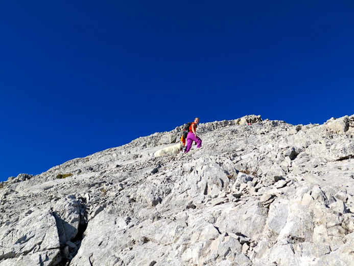 Von den Steinböcken beobachtet, steigt man die steile Rinne (II) empor bis man schlussendlich über steinige Platten zum Aussichtsreichen Ostgipfel mit seinem skurilem „Gipfelkreuz“ gelangt.