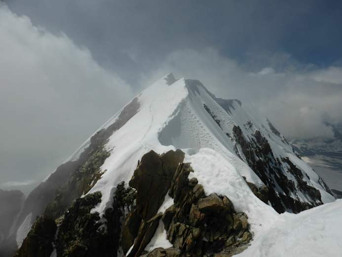 Etwas einfacher aber genussvoll und teilweise äusserst luftig kraxelt man anschliessend zum Mittelgipfel (4.160 m), wobei man auch auf Stellen in gemischtem Gelände trifft. Nun sind die Schwierigkeiten vorbei und man gelangt über einen Schneegrat und eine Firnflanke zum Westgipfel (4.165 m), von welchem man anschliessend über den meist gut ausgetretenen Pfad des Normalwegs die Bergstation Klein Matterhorn erreicht.