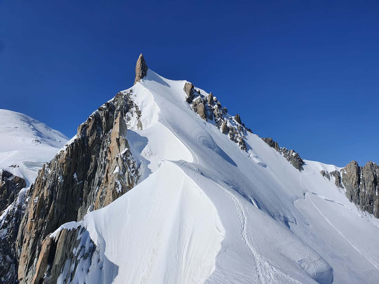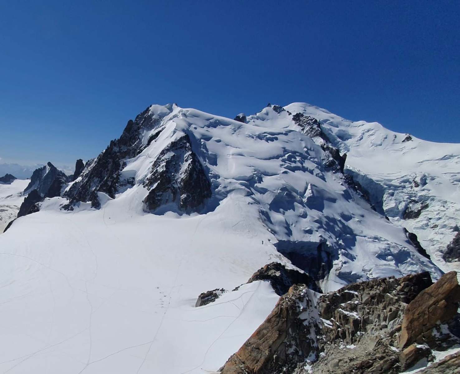 Austieg zum Mont Maudit (links), rechts die Spur zum Col du Maudit zum Col Maudit Foto: Simone Bürgler