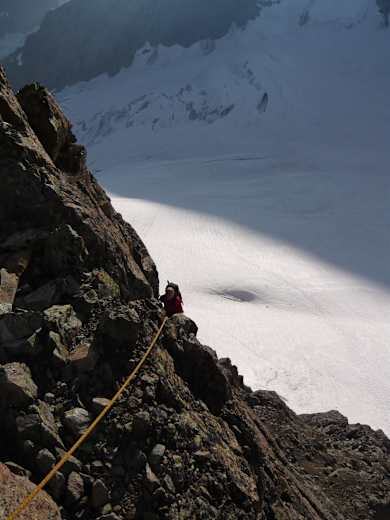 Diesen quert man oberhalb der Spaltenzone (ca. 3.100 m) in einem weiten Bogen gegen Westen (wegen Eisschlaggefahr aus der Nordwestflanke nicht zu weit nach Südwesten ausholen). So erreicht man den Einstieg des gut mit Bohrhaken abgesicherten Eselsgrates auf ca. 3.250 m und gelangt über den Grat an den Fuss des grossen Felsaufschwungs. Dieser wird direkt an der Kante respektive etwas links davon in der Ostflanke erklettert (II-III), bis man die flache Gratschneide oberhalb des Felsaufschwungs erlangen kann. In der westlichen Flanke erreicht man durch einen offenen Kamin und rechts um die Ecke das Ende des Eselsgrates.