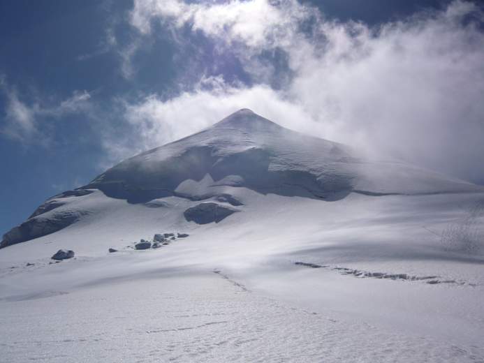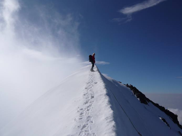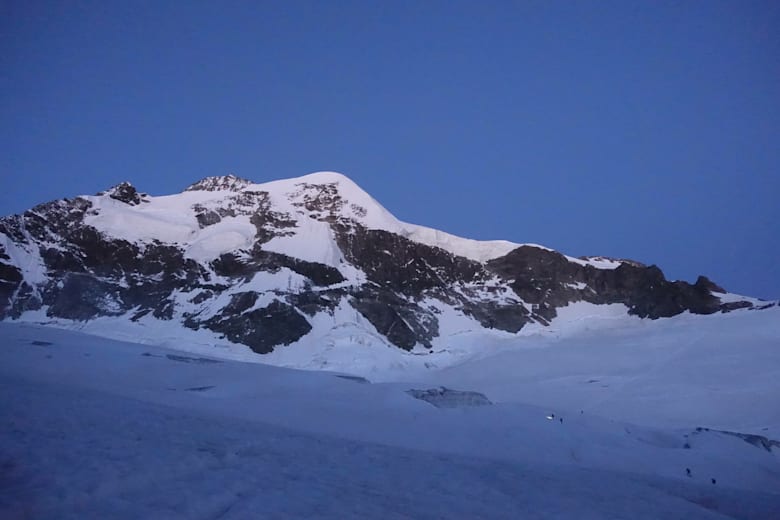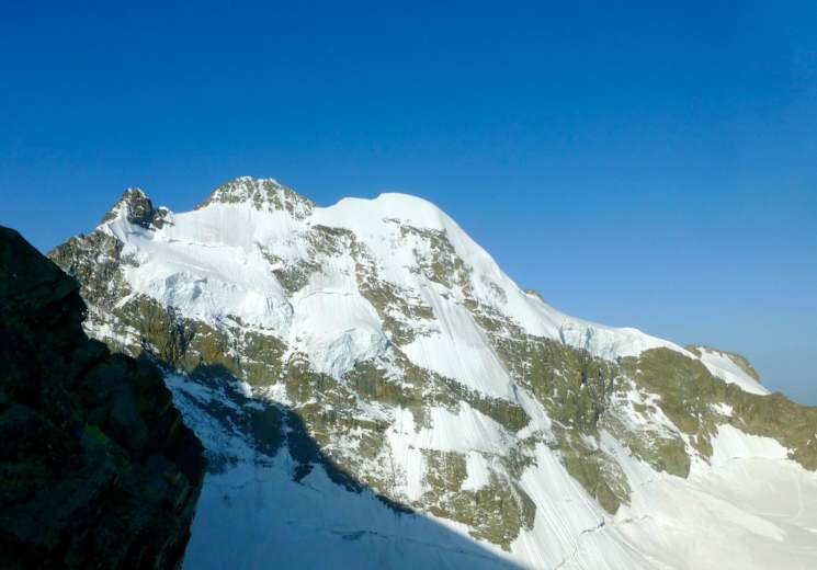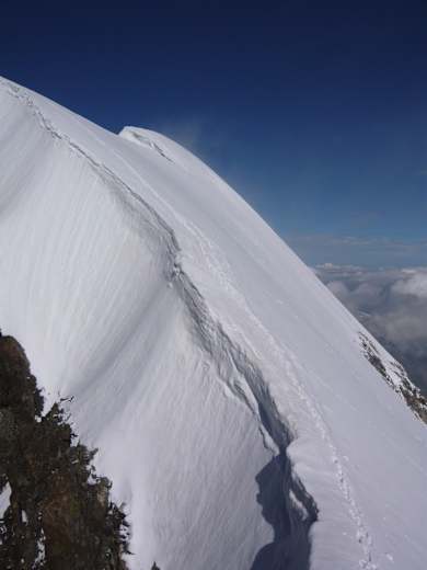 Von hier aus steigt man über den Gletscher an der Schulter (3597 m) vorbei und weiter über Firnhänge zur Schneekuppe (3.917 m). Nach einem kurzen Abstieg in den Sattel (bei Vereisung heikel) klettert man leicht aber exponiert zum Hauptgipfel.