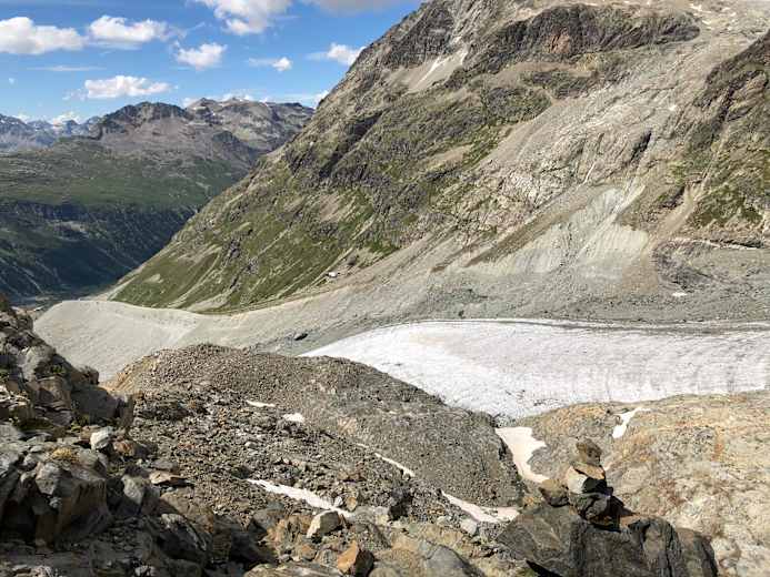 Der Abstieg über die Moräne zur Hütte ist lang und mühsam Foto: Simone Bürgler Bildergalerie (9)
