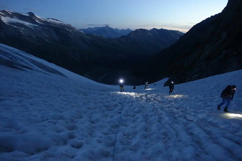 Der Abstieg erfolgt über die Aufstiegsroute, wobei nicht der ganze Eselsgrat abgeklettert werden muss. Eine eingerichtete Abseilpiste (viermal abseilen) führt direkt auf den Gletscher.