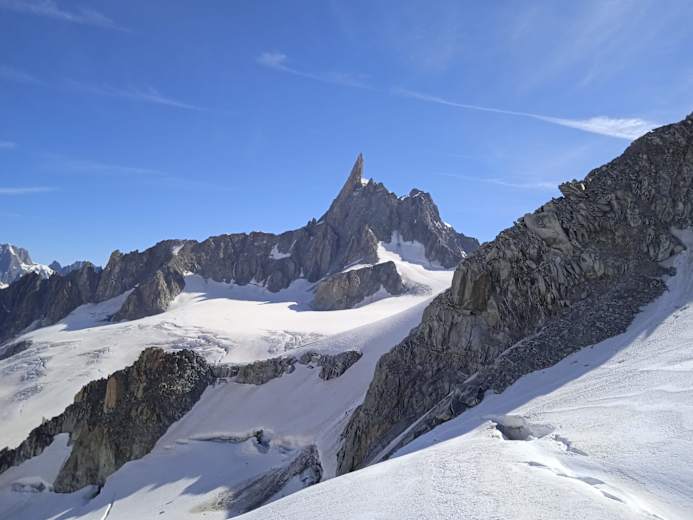 Schon von weitem sticht einem dieser Riesenzahn des Dent du Géant in der Mont-Blanc-Gruppe ins Auge und weckt den Wunsch, einmal dort oben zu stehen. Dank Fixseilen ist eine Besteigung auch gar nicht so schwer, wie man von weitem vermuten würde. Kein Wunder, ist der Andrang an gewissen Tagen gross und Stau nicht unüblich.