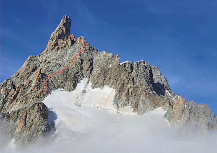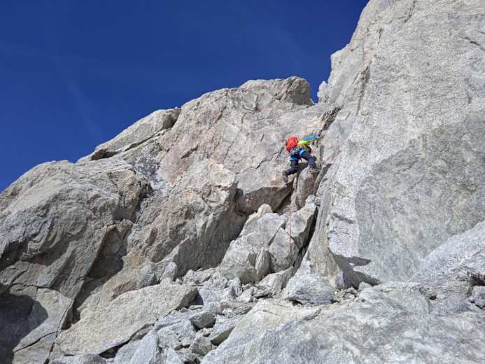 Vom „Petit Flambeau“ beziehungsweise der Punta Helbronner geht man erst flach, dann immer steiler ansteigend über den Gletscher „Glacier du Géant“, bis man auf ca. 3.600 m den Bergschrund überwinden kann. Über Wegspuren, Geröll und ein paar Felsstufen steigt man nun zum Frühstücksplatz auf, wobei sich Gehgelände mit Kletterstellen abwechselt. Dabei bewegen sich ein paar wenige, mit Fixseilen oder Bohrhaken ausgerüstete Stellen im III. Grad.