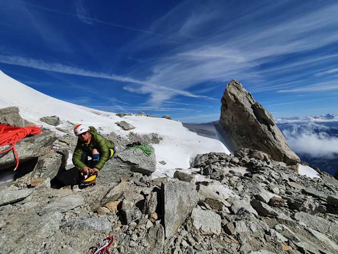 Beim geräumigen Frühstückplatz macht man sich schliesslich für die Kletterei bereit und deponiert die für den Gipfelaufstieg nicht benötigte Ausrüstung. Um die Kante herum gelangt man auf die Nordwestseite, wo sich der Einstieg der Kletterei befindet.