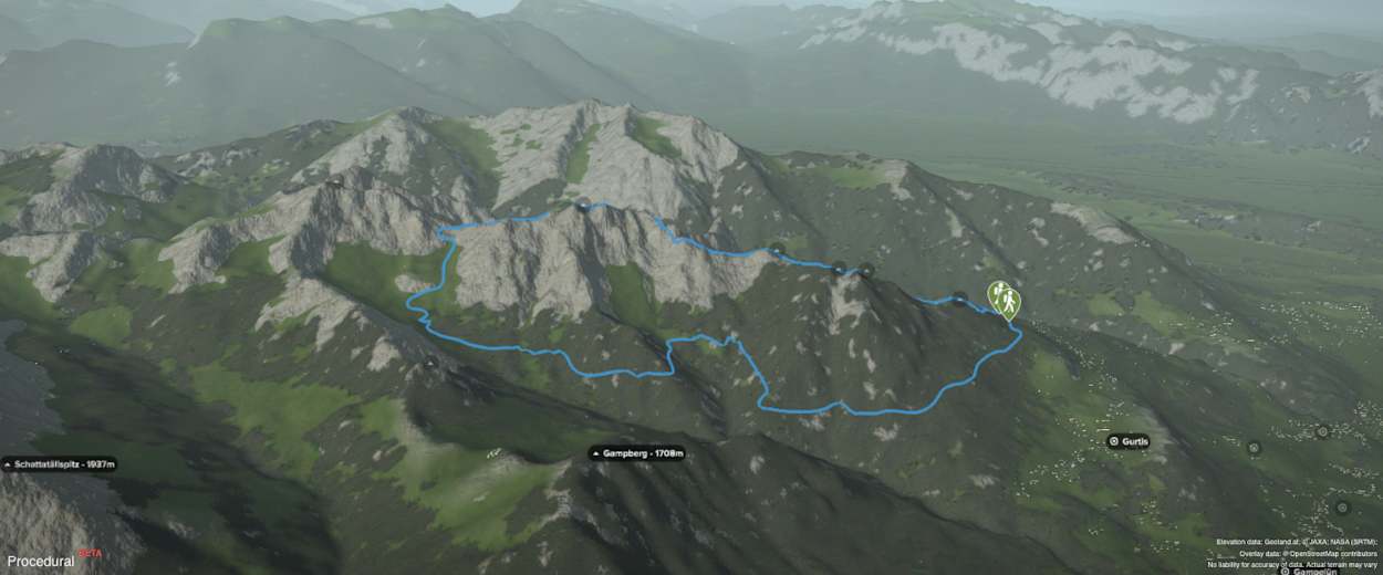 Weiter wandert man am Almweg um die Gurtisspitze herum und erreicht einen Fahrweg, dem man in nördlicher Richtung folgt. Bei der Straßenkreuzung nach links auf die ansteigende Straße. Über den Bazora Rundweg erreicht man die große Bazorapiste, überquert diese und gelangt zum Anstiegsweg bei der ersten Hütte. Von hier aus geht es retour über den Westhang zum Ausgangspunkt.