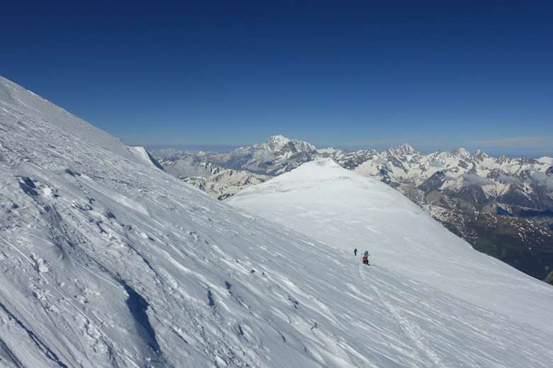 Den zweiten Aufschwung erklettert man rechts durch ein Couloir (II), den dritten Aufschwung über eine Firnschulter. Nun gelangt man direkt auf den Gipfel des Combin de Valsorey (4.185 m). Man steigt über den Firngrat in den Sattel (4.128 m) ab, quert etwas nach links und erreicht über einen Firnhang den Combin de Grafeneire (4.314 m).