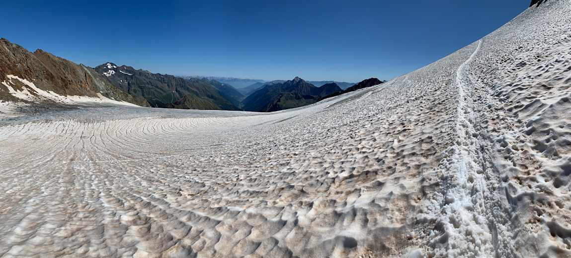 Blick vom Pfaffenjoch über den Sulzenauferner ins Stubaital. Der nächste Teil des Anstiegs verläuft über den Gletscher (siehe Spur). Foto: Matthias Knaus