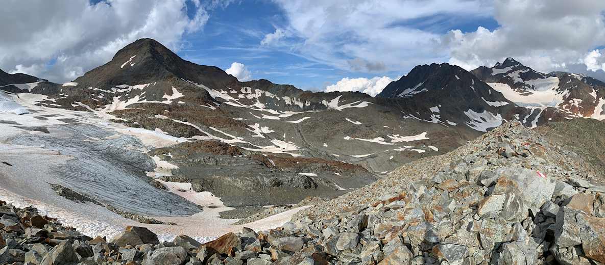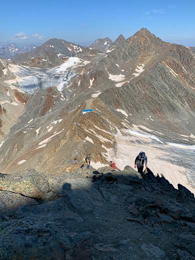 Der 3.498 m hohe Gipfel der Pfaffenschneid ist der zweithöchste Punkt in den Stubaier Alpen. Bis vor wenigen Jahren wurde er verhältnismäßig selten bestiegen, wenn dann im Zuge der Überschreitung zum Zuckerhütl. Nachdem das Zuckerhütl aktuell starken Permafrostveränderungen unterliegt und sich in den Sommermonaten zunehmend brüchig und felssturzgefährdet präsentiert, wird ersatzweise gerne die Pfaffenschneid bestiegen, denn sie beschreibt eine ebenfalls großartige und verhältnismäßig einfache Hochtour, bei der man sich inmitten der Gletscher- und Dreitausenderwelt des Hochstubai befindet. Die Tour wird vom Schaufeljoch als Tagestour beschrieben, ebenfalls ist es möglich auf der Hildesheimer Hütte zu nächtigen und von dort aus zu starten.
