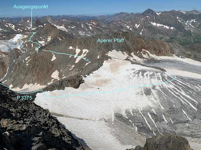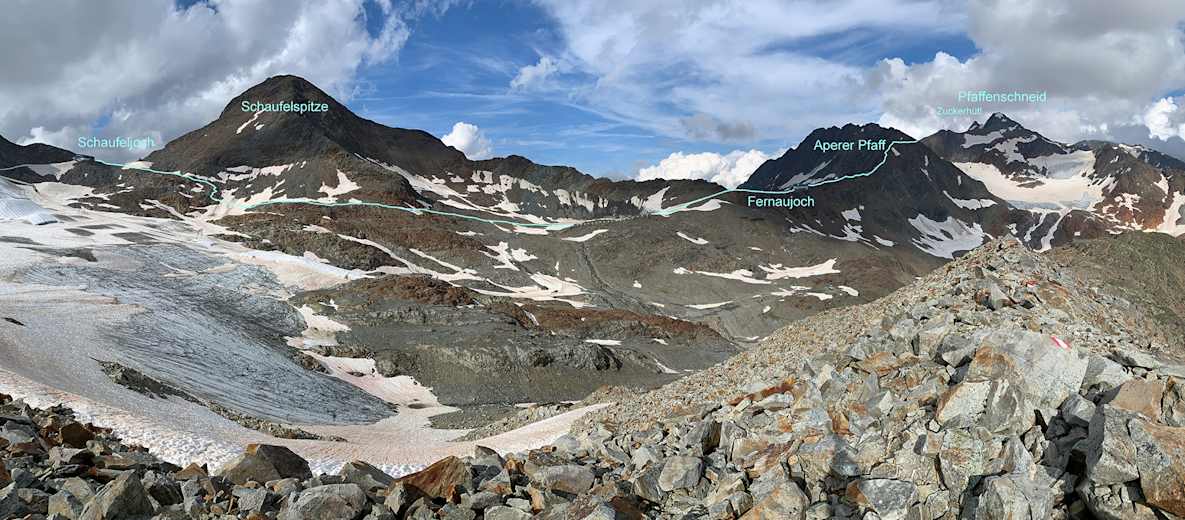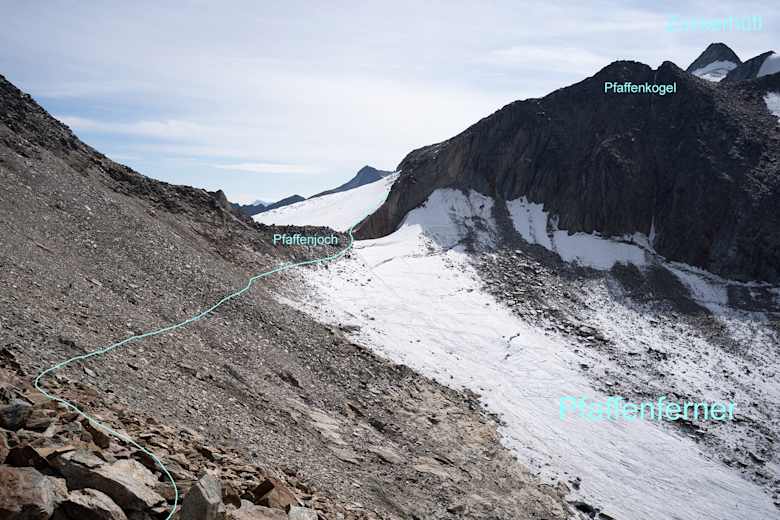 Vom Schaufeljoch unterhalb der felsigen Südflanke der Schaufelspitze in Geröll- und Moränengelände absteigen (Steinmännchen weisen den Weg). Die Route verläuft in südöstlicher Richtung. Ein namenloser, kleiner See bildet den tiefsten Punkt des Übergangs zum Fernaujoch, das nach ca. 45min. Gehzeit erreicht wird. Am Schaufeljoch befindet sich die Seilbahnstation Fernau (3.060m), von der die Route meist weglos aber mit Steinmännchen markiert dem NW-Grat des Aperen Pfaff aufwärts folgend weiter führt. Der Grat sieht von der Ferne betrachtet schwieriger aus als er ist. Teilweise vorhandene Wegspuren leiten durchs Blockgelände, meist verläuft die Route direkt am Grat. Weicht man in die Felsflanken aus, wird das Gestein brüchig. Auf etwa 3.220m Seehöhe ist ein markanter Steinmann erreicht, von dem aus man kurz nach Süden geht, um eine Schulter zu erreichen, die den Übergang zum Pfaffenferner ermöglicht. Von der Schulter leicht absteigend Richtung Pfaffenjoch (3.207m), das im letzten Teil über den dünn vorhandenen Pfaffenferner erreicht wird. Dieser Abschnitt weist nach schneereichem Winter im Frühsommer oft große Altschneefelder auf. Sie sind steil und können das Tragen von Steigeisen verlangen. Ist der Abschnitt trocken, folgt man den Steinmännchen bis auf’s Eis. Liegen die Felsblöcke vor dem Pfaffenjoch bereits auf Blankeis, ist Vorsicht geboten.
