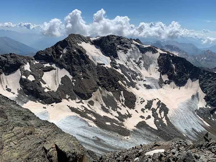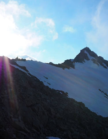 Blick zum Zuckerhütl (3.505m). Der Übergang ist eine reizvolle Hochtour, allerdings bewegt man sich oft auch in brüchigem Gestein. Foto: Matthias Knaus