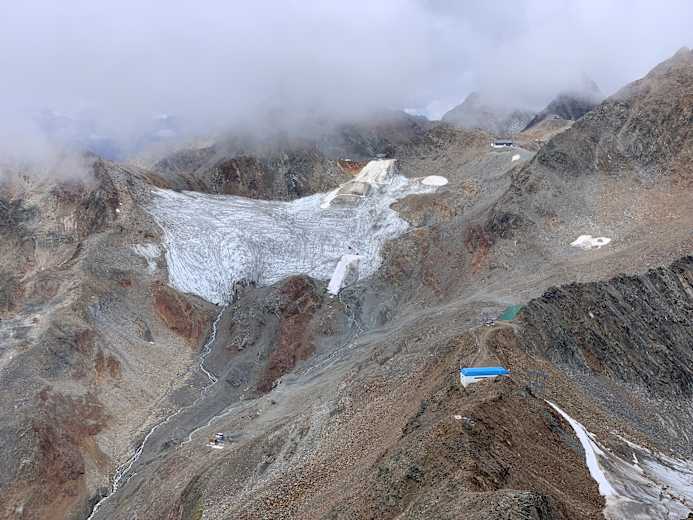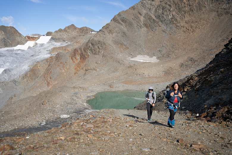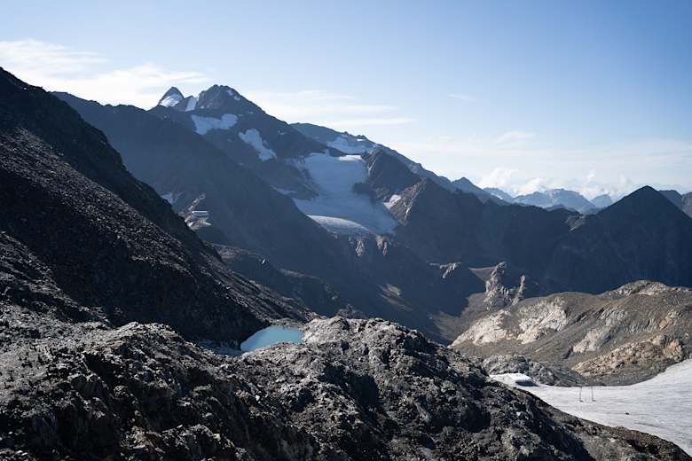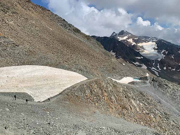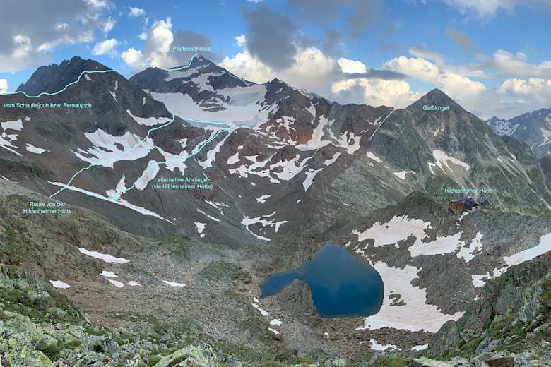 Vom Pfaffenjoch über den Pfaffenferner absteigen und auf markierter Route zur Hildesheimer Hütte. Der zusätzliche Weg von ca. 45 Gehminuten wird durch die Möglichkeit einer Einkehr wett gemacht.
