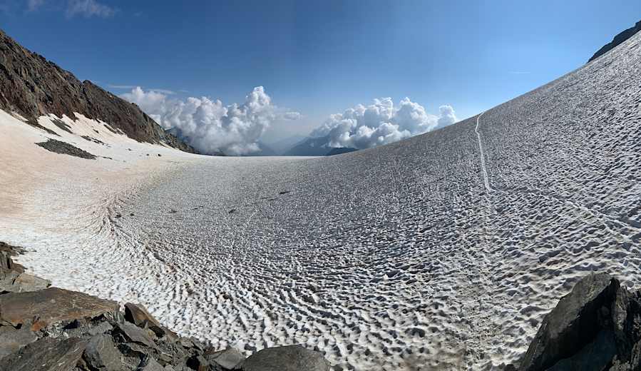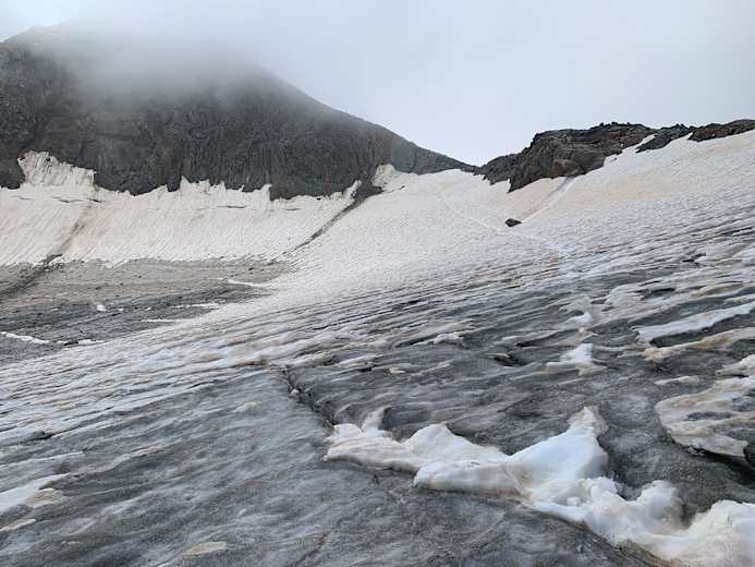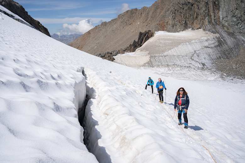 Bei aperem Gletscher (später in der Saison) sind die Spalten gut sichtbar. Foto: Matthias Knaus