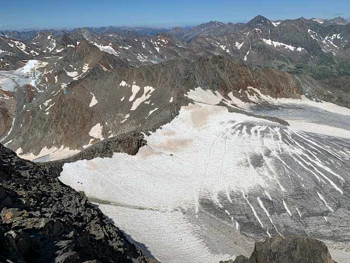 Blick vom Gipfel zur Aufstiegsroute im Bereich des Pfaffenkogel. Foto: Matthias Knaus