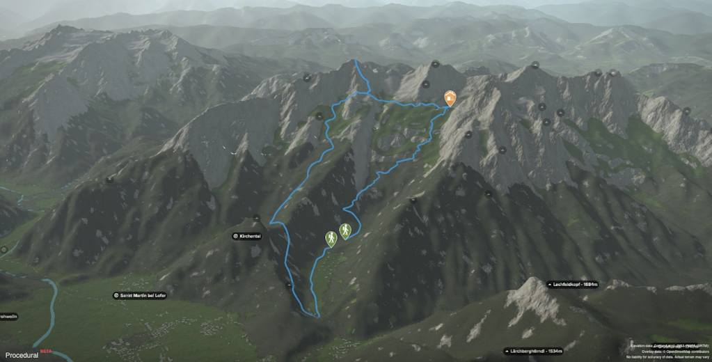 Bevor man die Waldgrenze erreicht, kommt man noch an der Biwackschachtel, welche sich unter einen großen Felsbrocken duckt, vorbei. Immer links haltend erreicht man schließlich eine Forststraße. Rechts geht es hinab nach St. Martin. Man wandert aber links weiter und erreicht nach einem Gegenanstieg von rund 200 hm den Sattel in der Schwarzwand (der Wechsel auf 1.048 m). Nun auf schmalem Weg hinab ins Loferer Hochtal bis zur Straße. Dort geht man nach links und erreicht nach rund 15 m den Parkplatz.