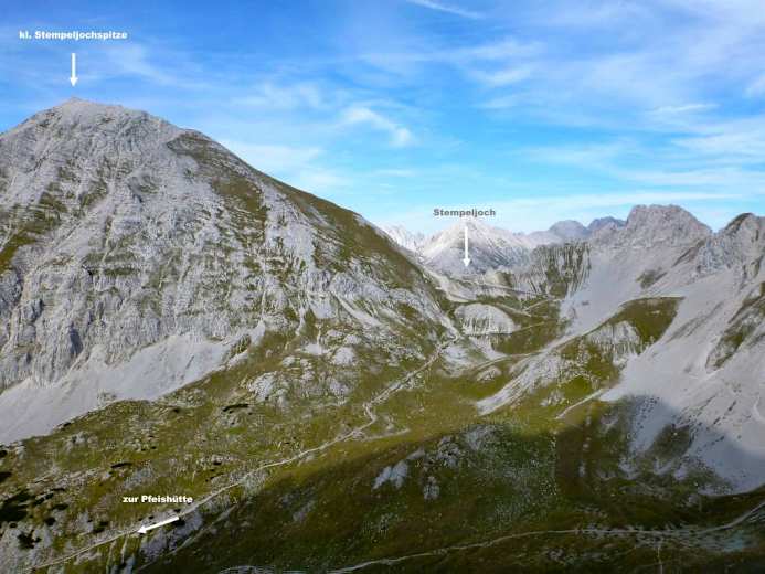 Von der Hütte aus ca. 200 m den breiten Fahrweg Richtung Osten folgen. Dort auf den Pfad 221 immer aufwärts dem Weg Richtung Stempeljoch folgen, das man in einer Höhe von 2.215 m erreicht. Von hier aus kann man schon den weiteren Wegeverlauf gut einsehen.
