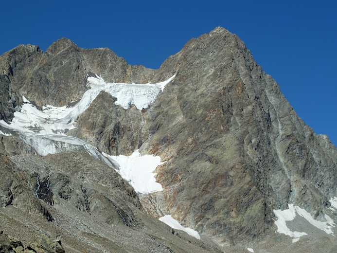 Im Einser- und Zweiergelände (UIAA I-II) steigt man weiter an, bis in einen schrofigen Kessel, der mit (verblassten) roten Punkten markiert ist. Ein großer, roter Pfeil, der über einem sandigen und etwas unangenehm zu gehenden Absatz liegt, gibt den Hinweis zur Querung nach links: Über ein schmales Band (UIAA II) gelangt man zu einer Kante, an der es erneut steil wird. Gerade hoch oder leicht nach links ausweichend überwindet man die Stufe (UIAA III). Anschließend wird’s wieder einfacher: Man bleibt stets am Grat (UIAA I-II, Steinmännchen), lediglich einmal klettert man 25 m luftig über eine Platte nach links, zum nächsten Gratabschnitt. Bis zum Gipfel (3.533 m) bleiben die Schwierigkeiten nun gering (UIAA I-II).